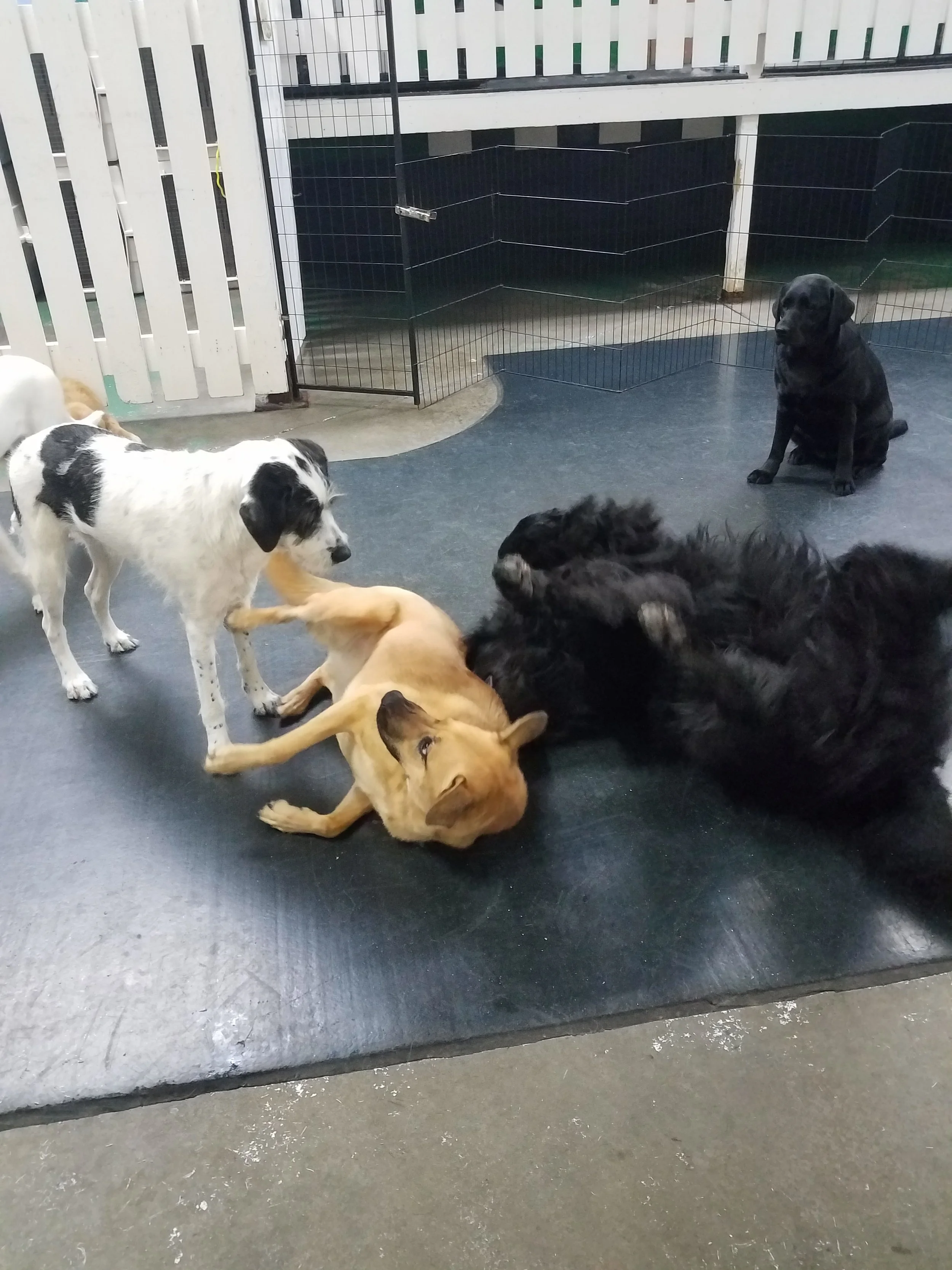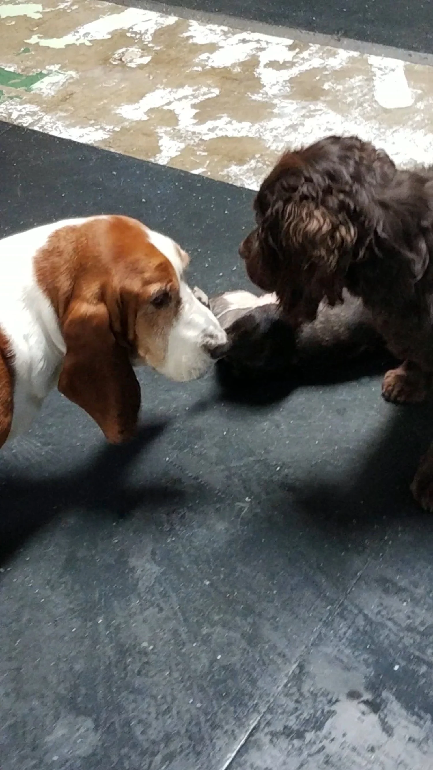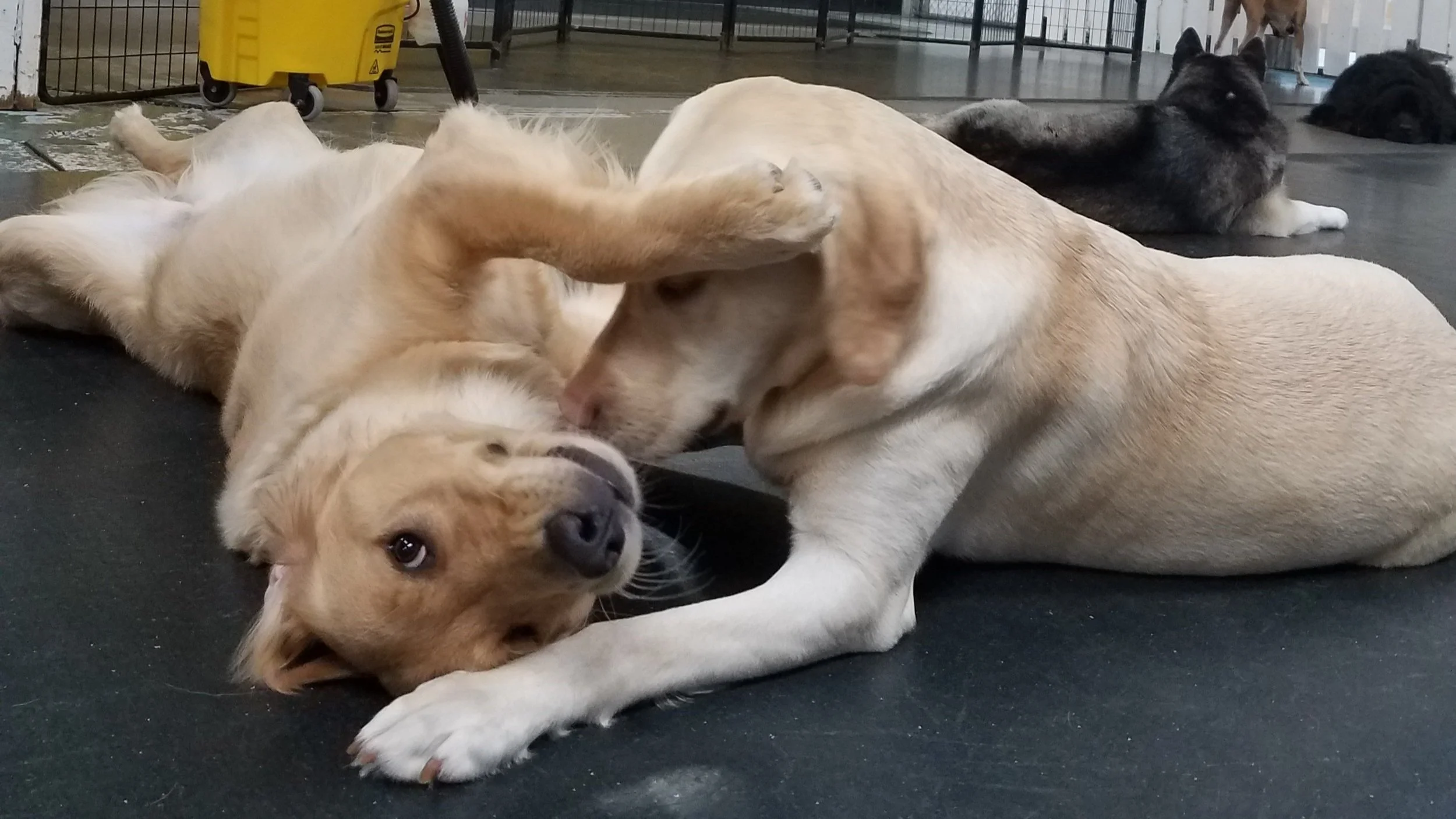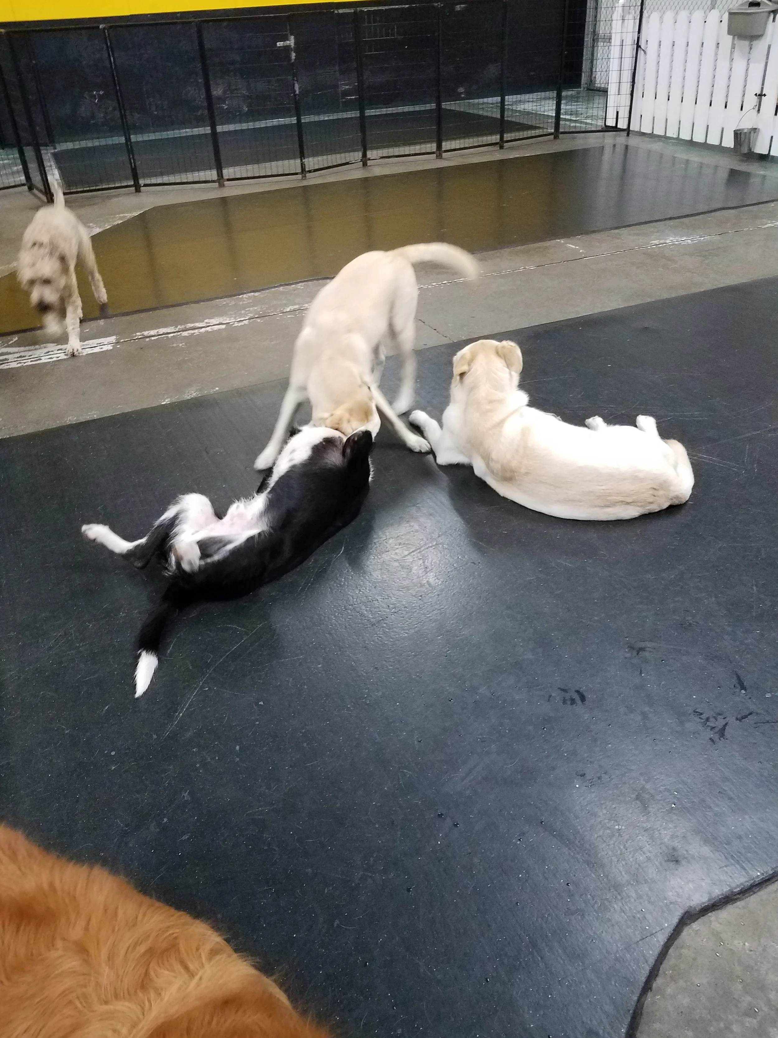 Belly up Sully invites Code to smell him, while in the background Oakuly invites Denali to play.