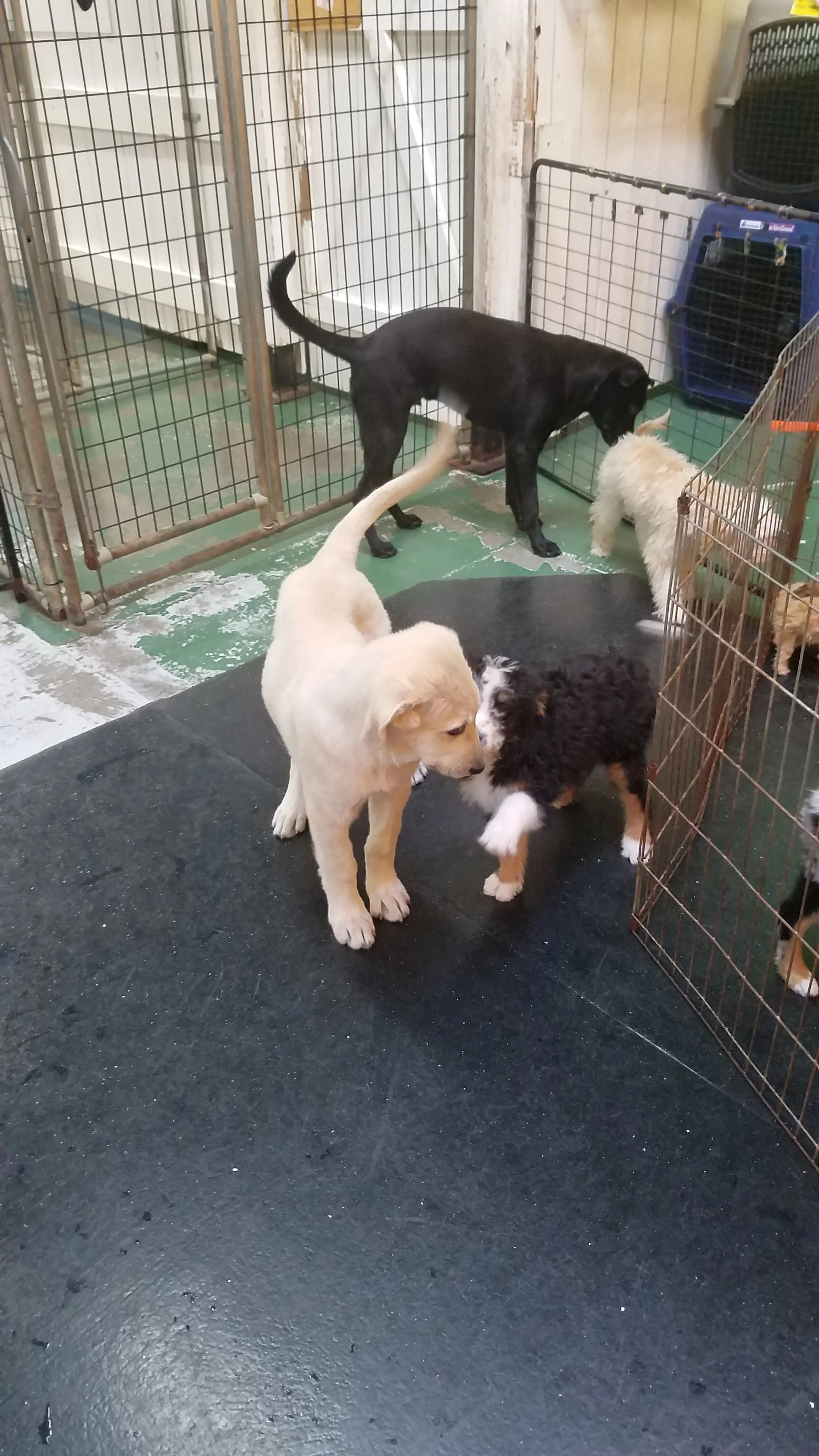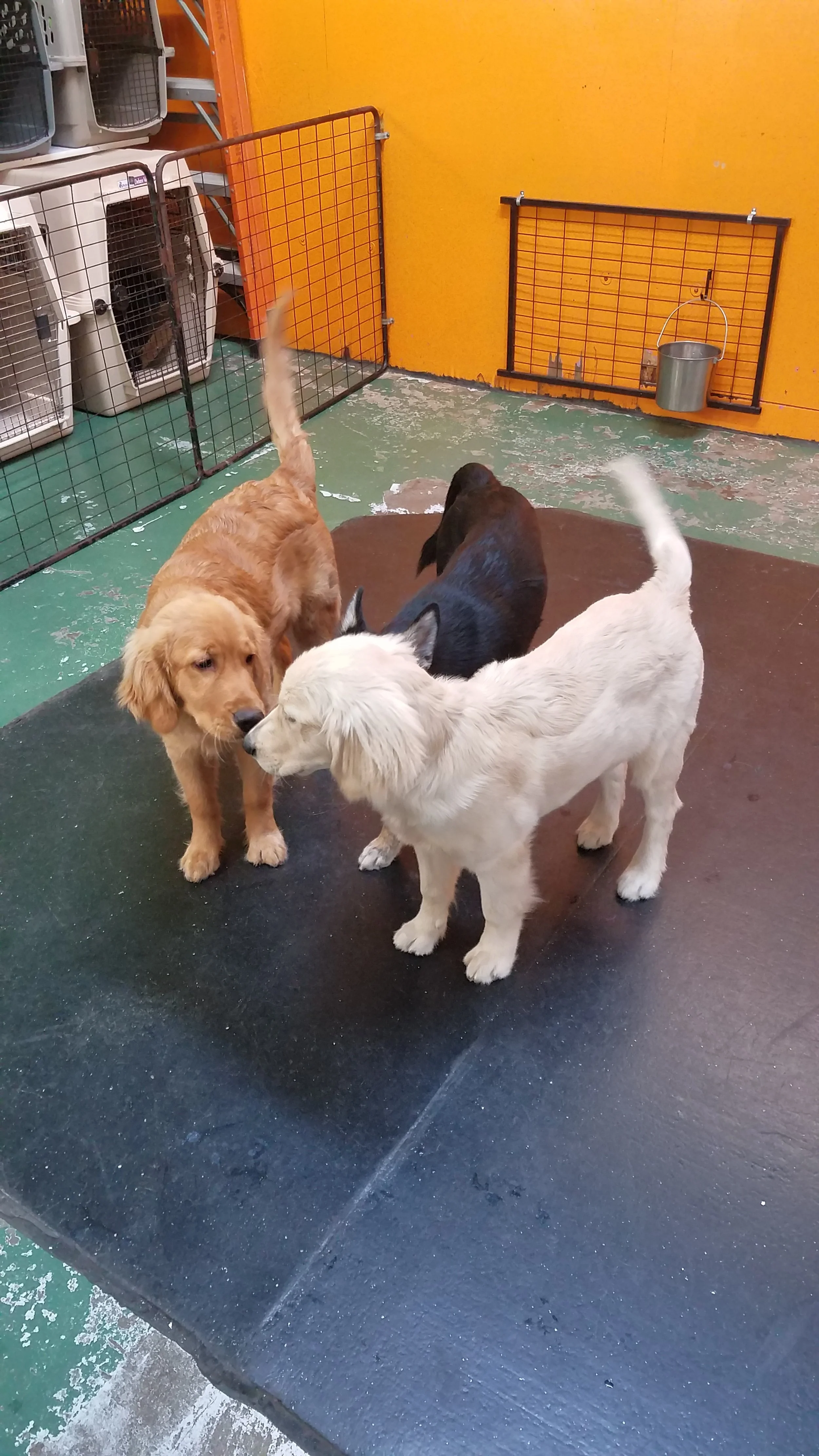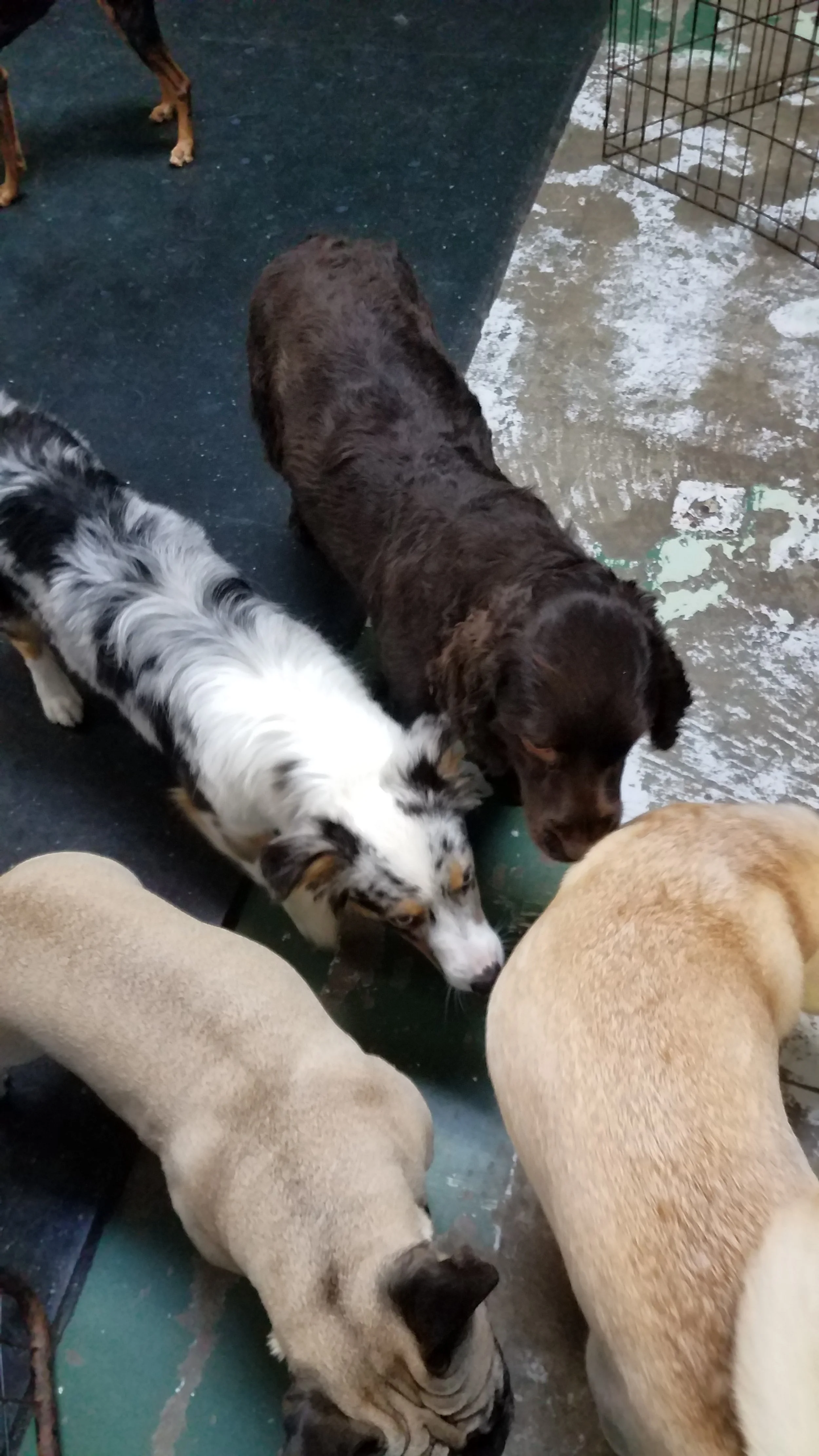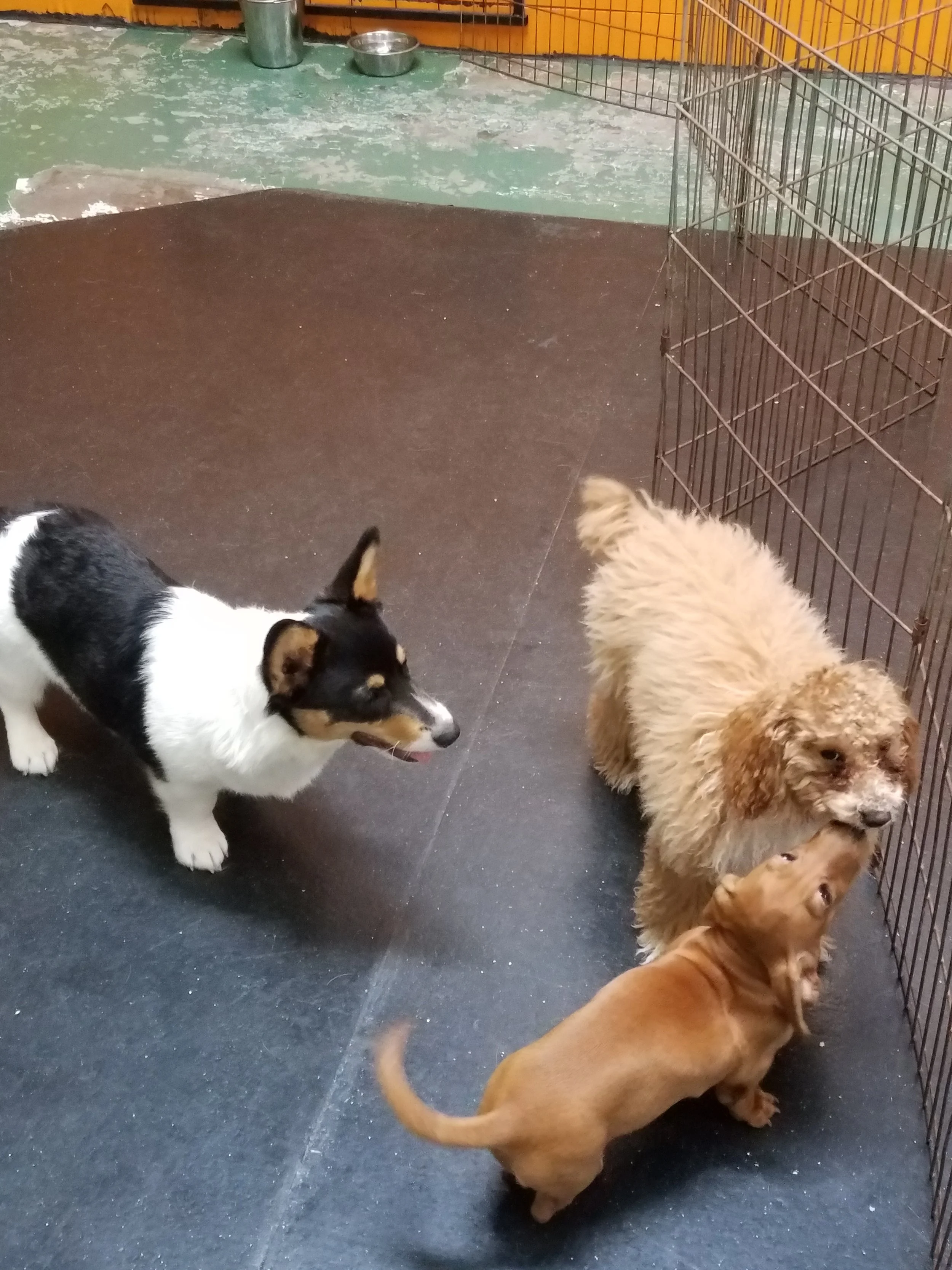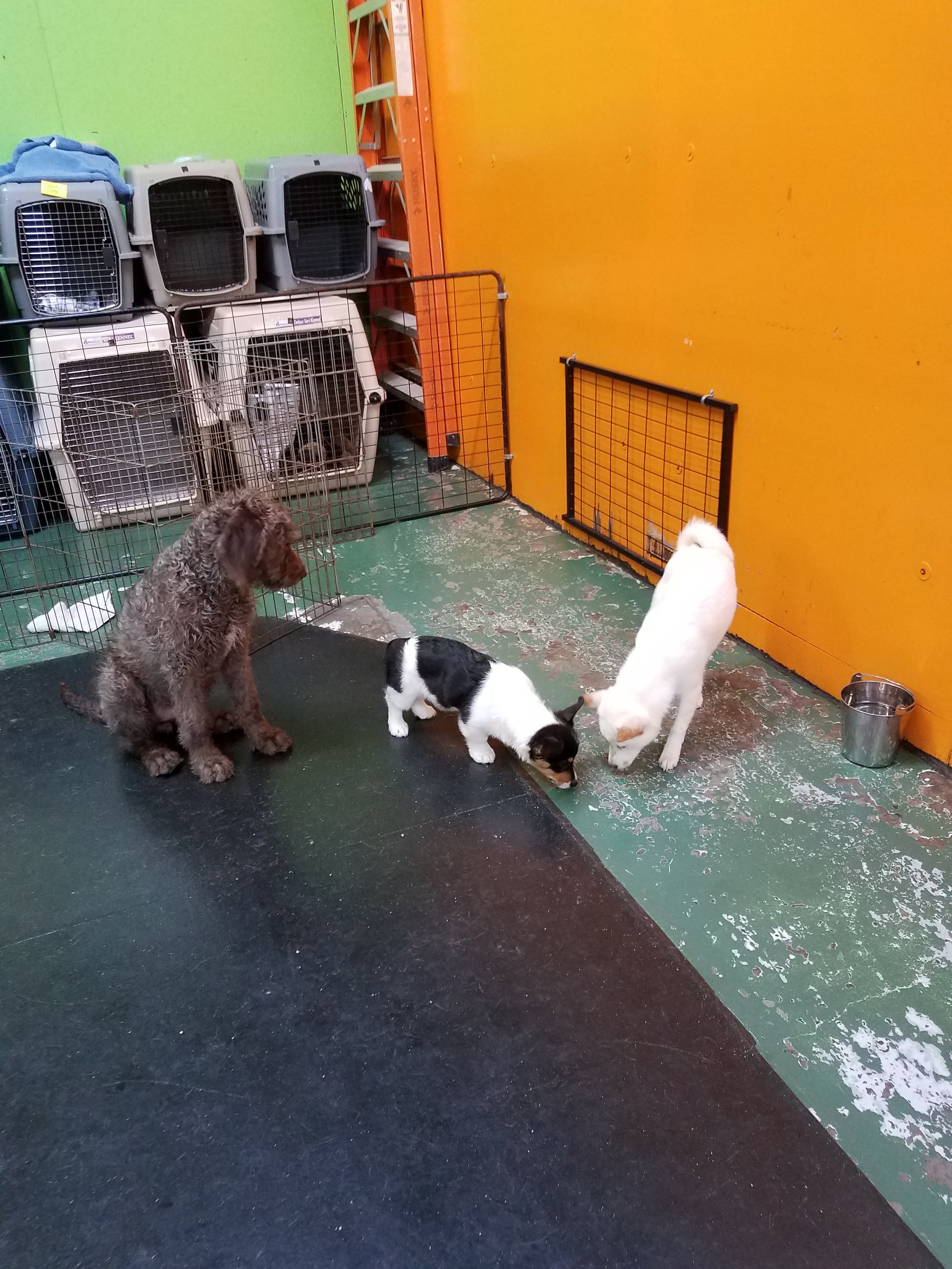 Belly up Sully invites Code to smell him, while in the background Oakuly invites Denali to play.