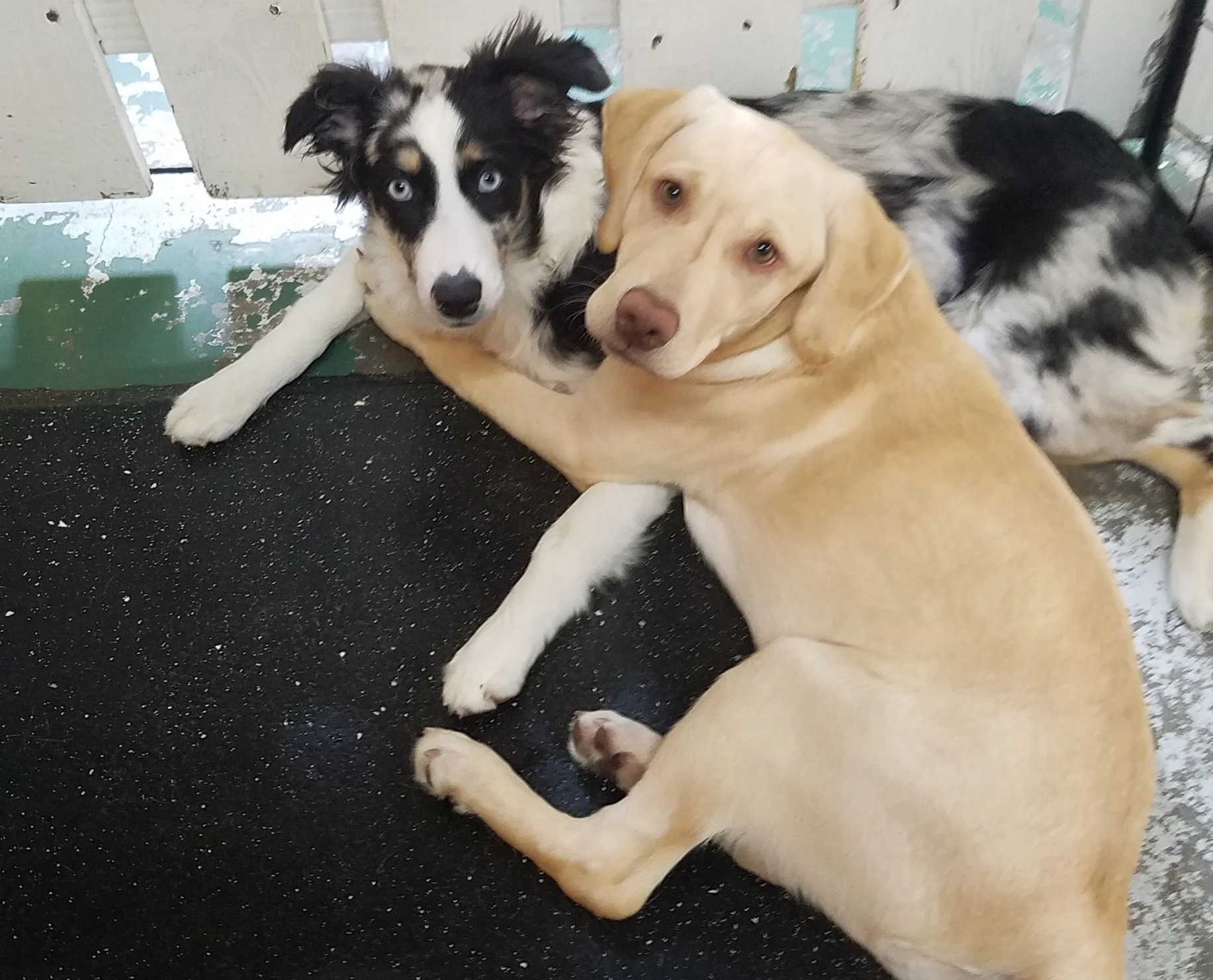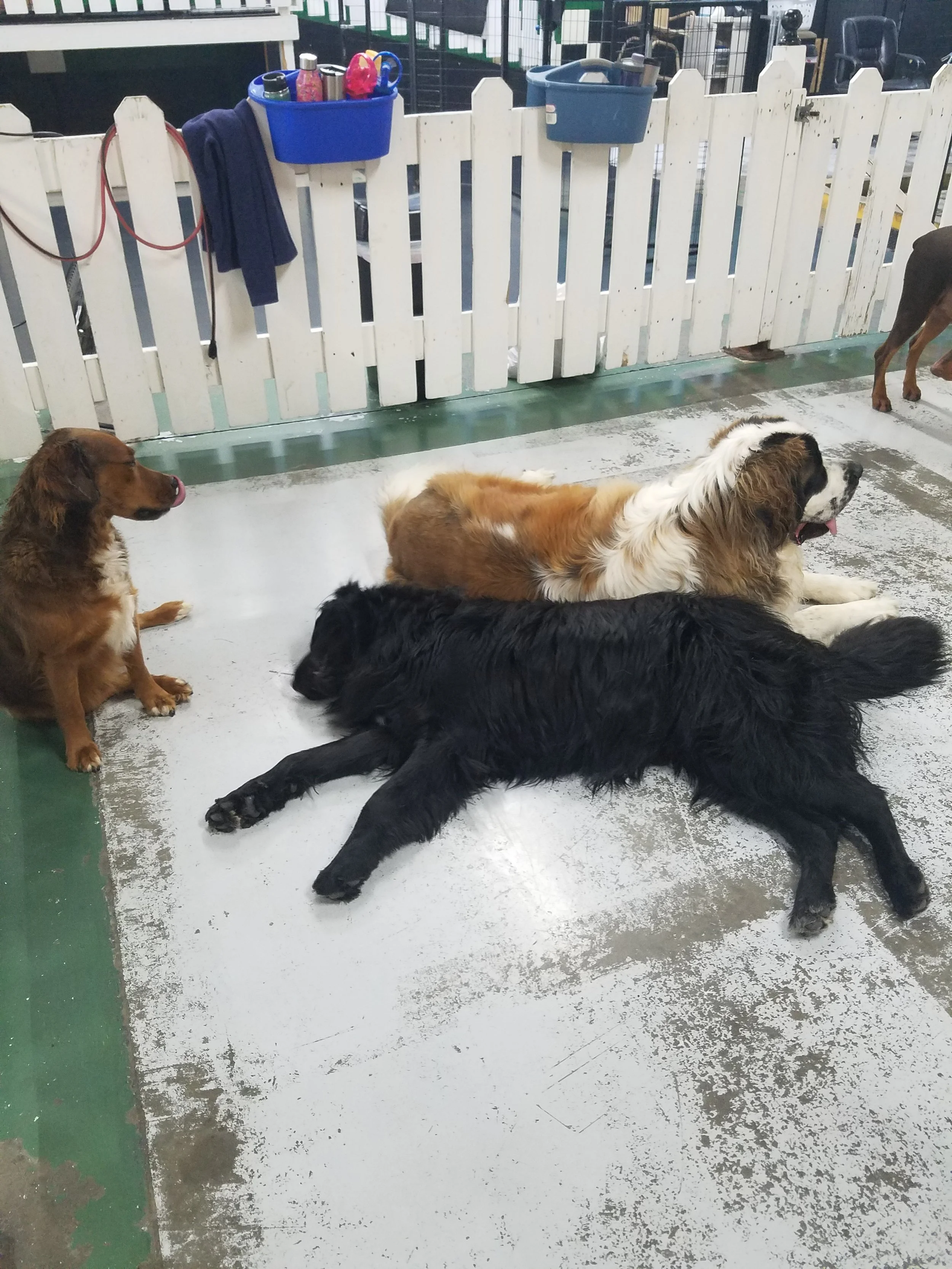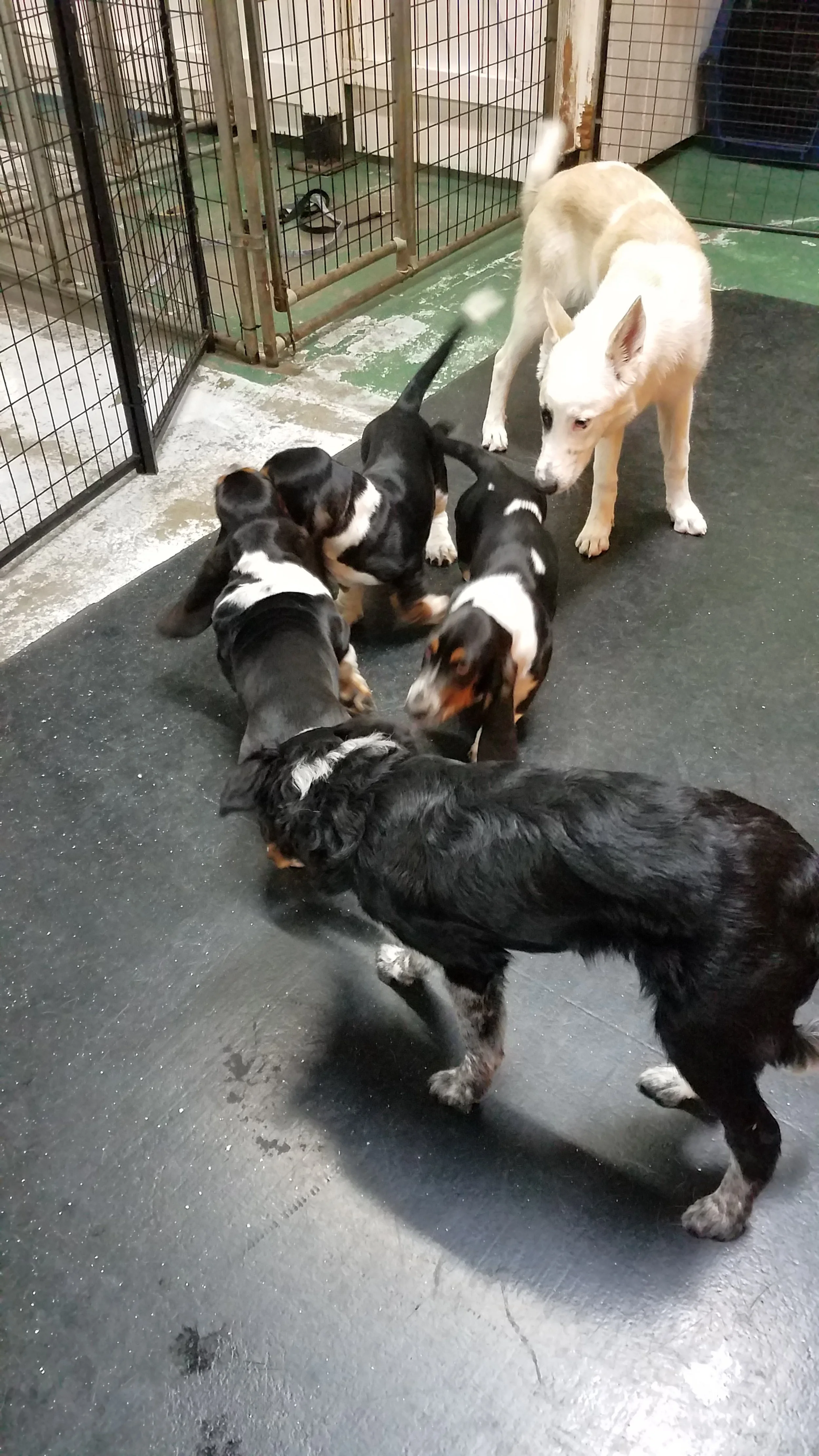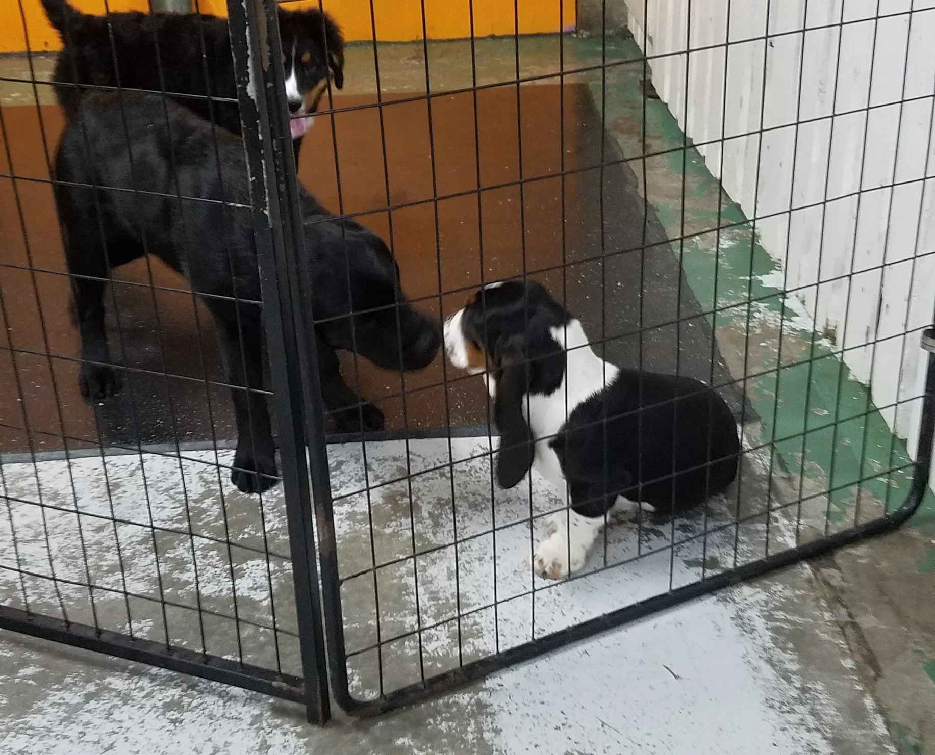 Belly up Sully invites Code to smell him, while in the background Oakuly invites Denali to play.