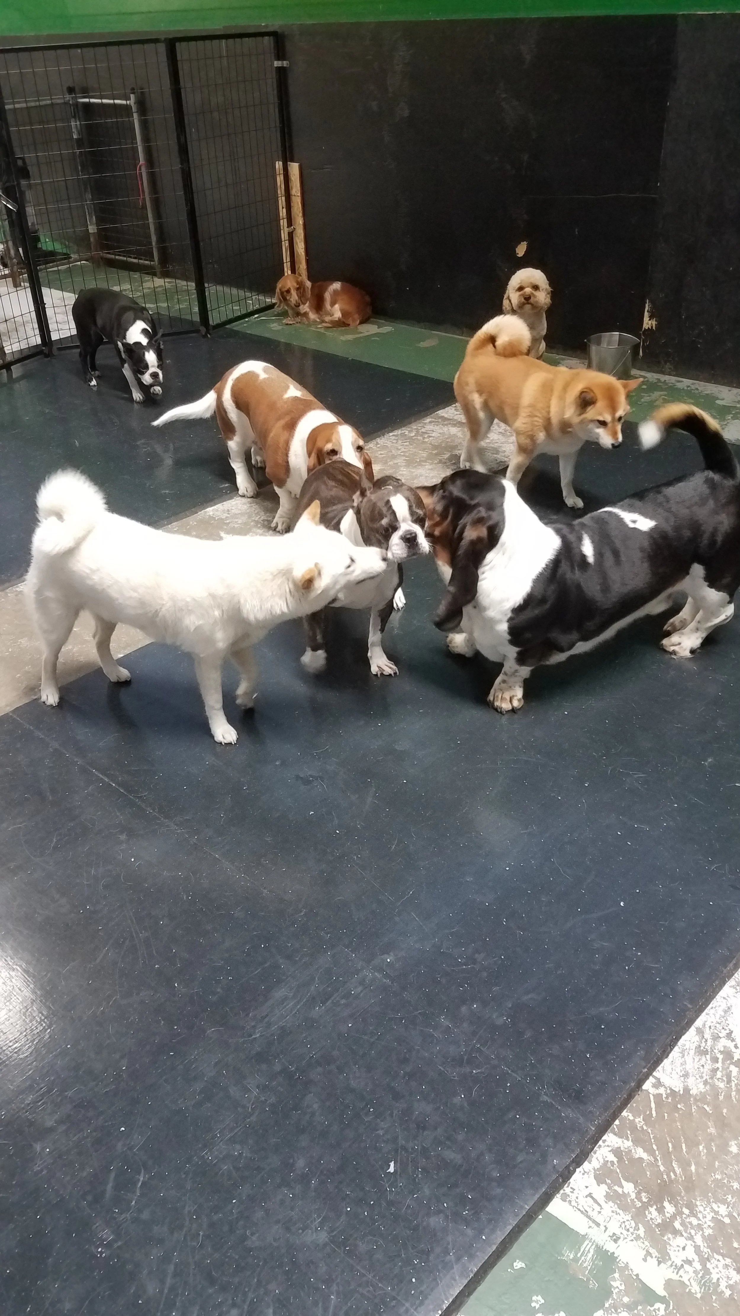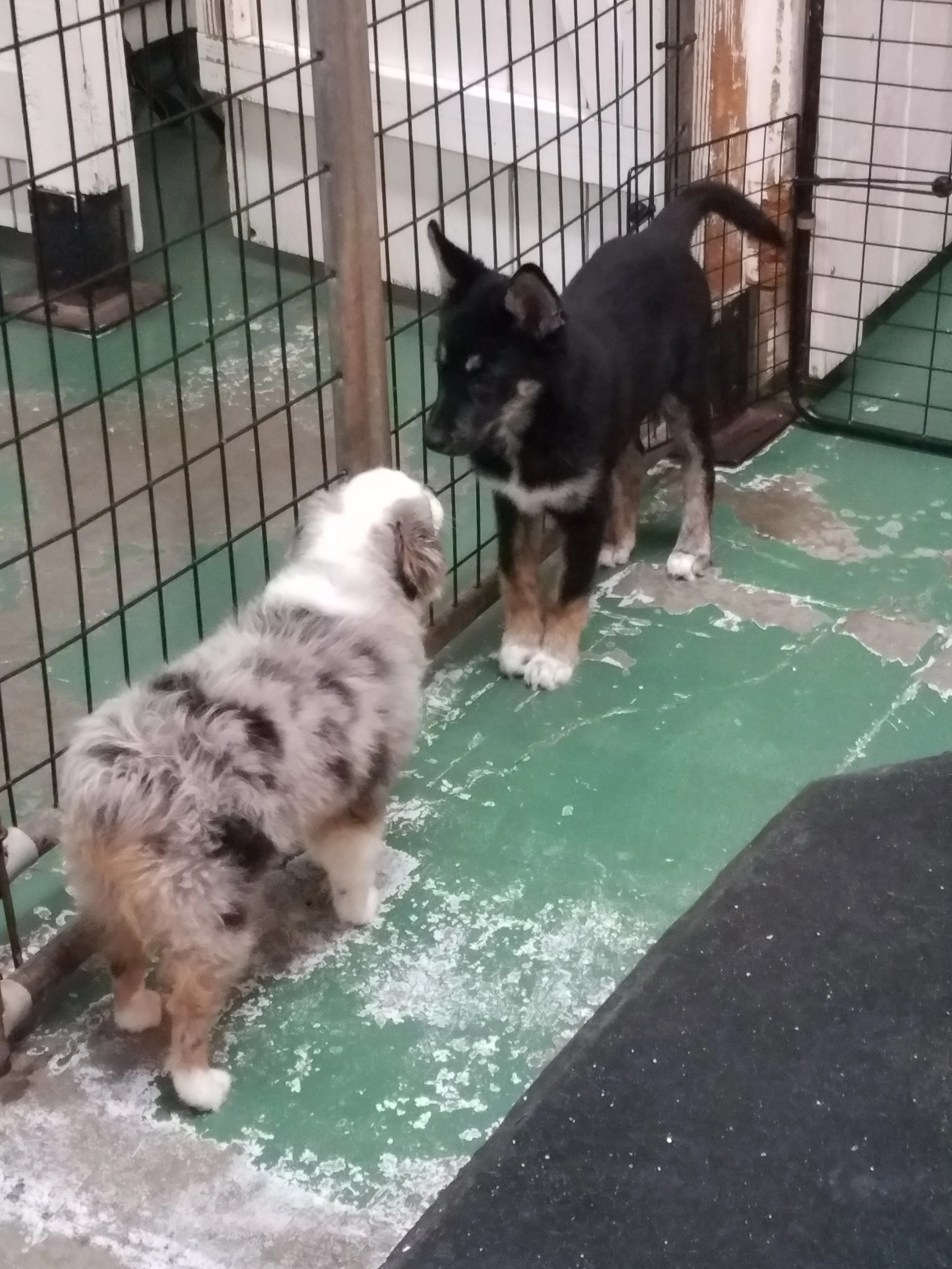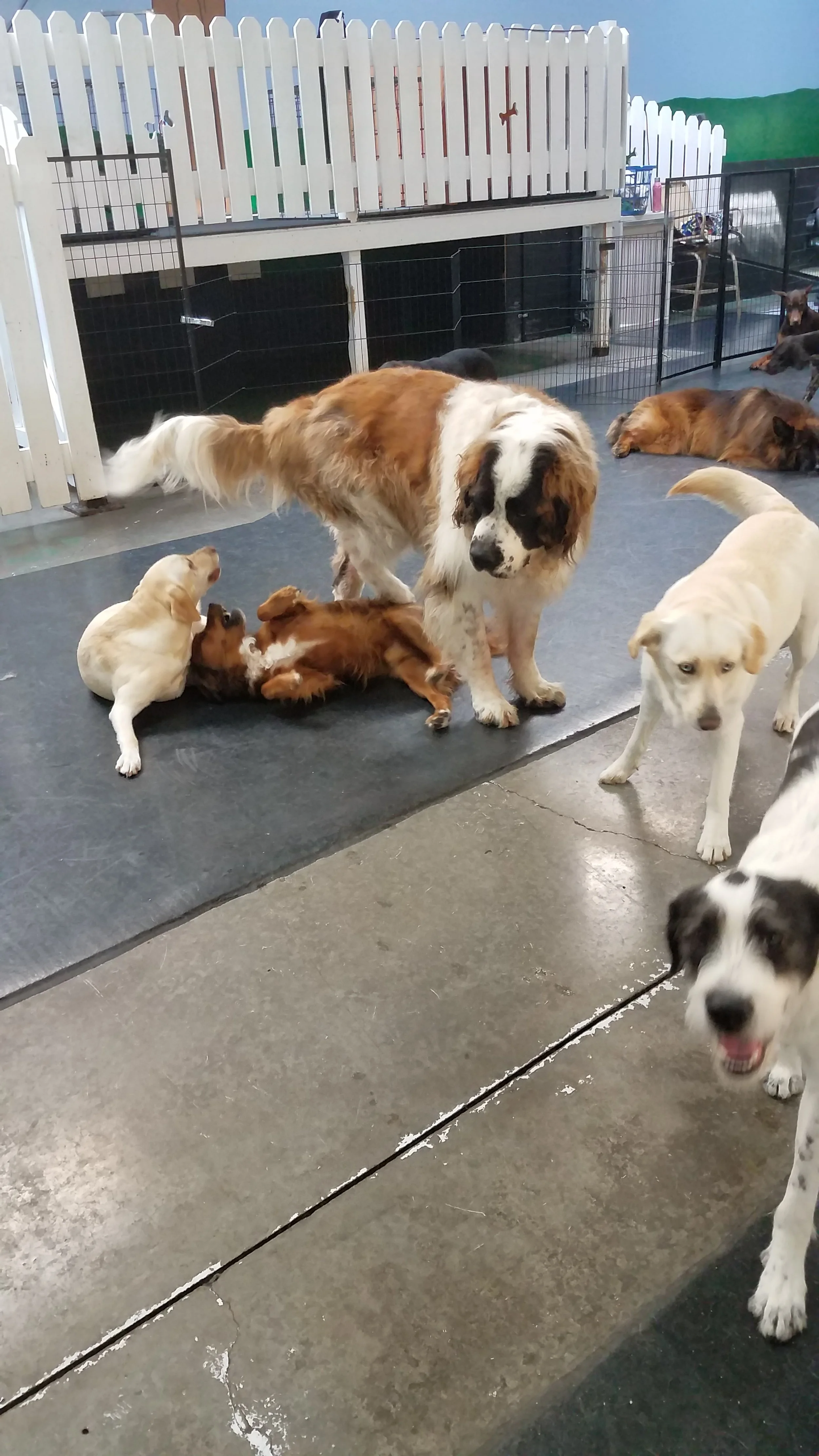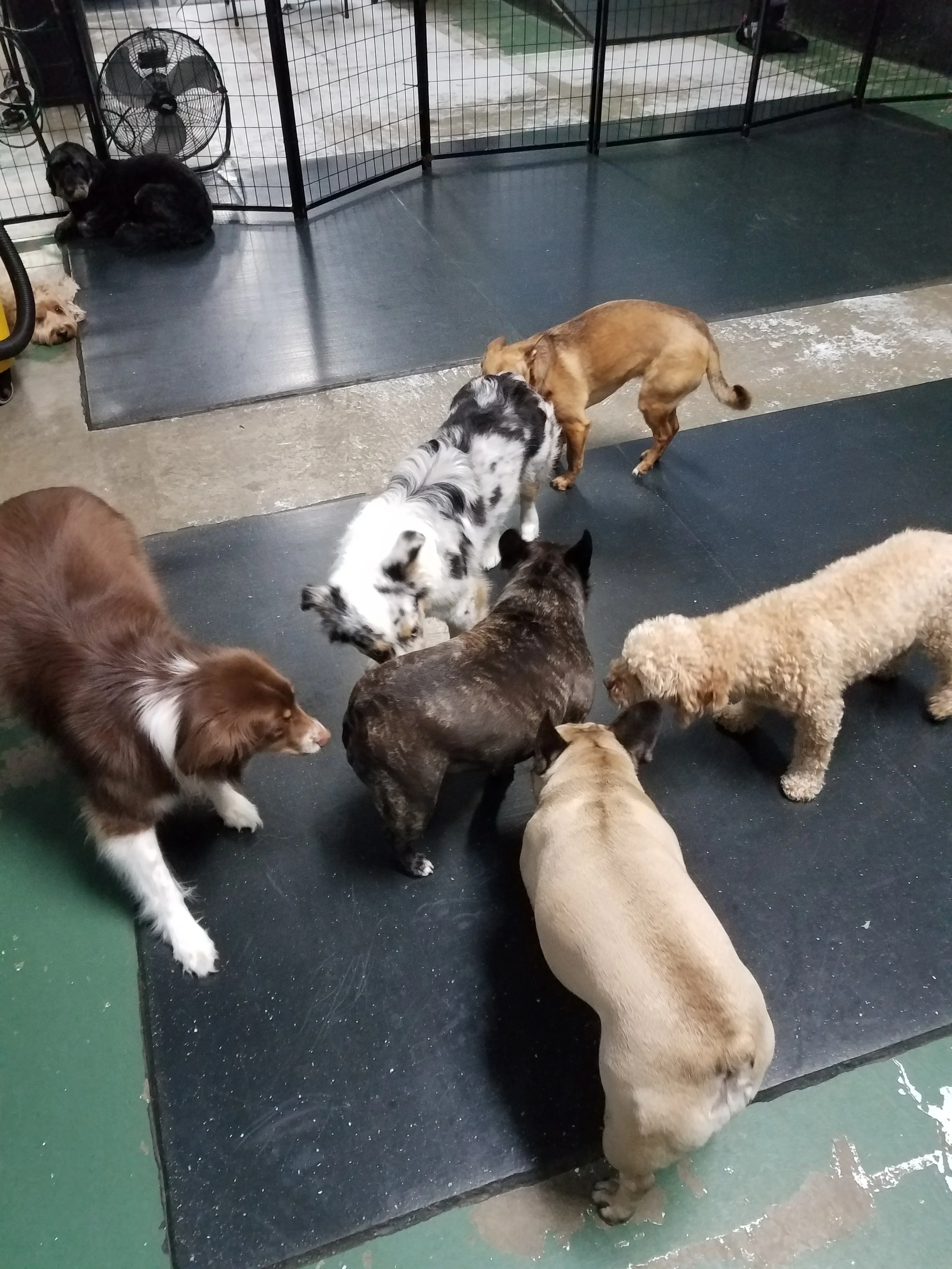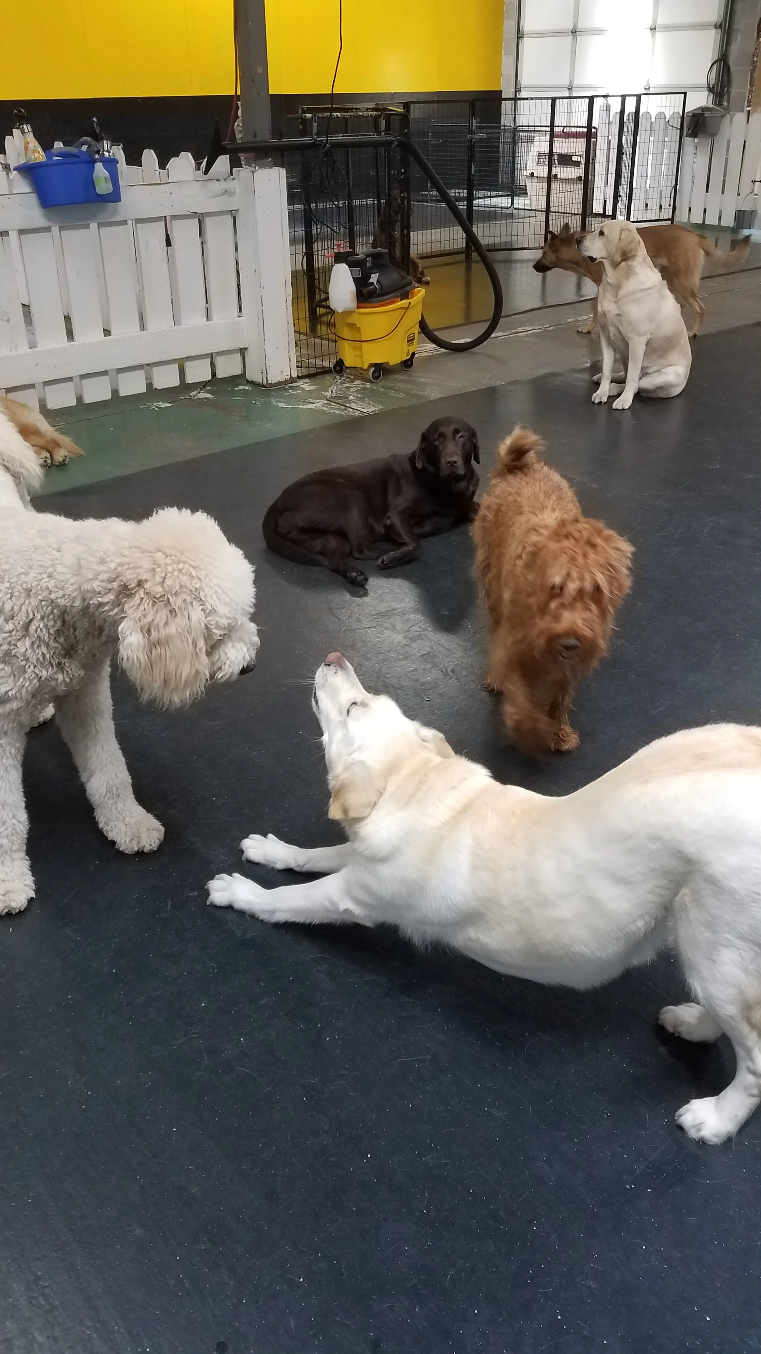Belly up Sully invites Code to smell him, while in the background Oakuly invites Denali to play.