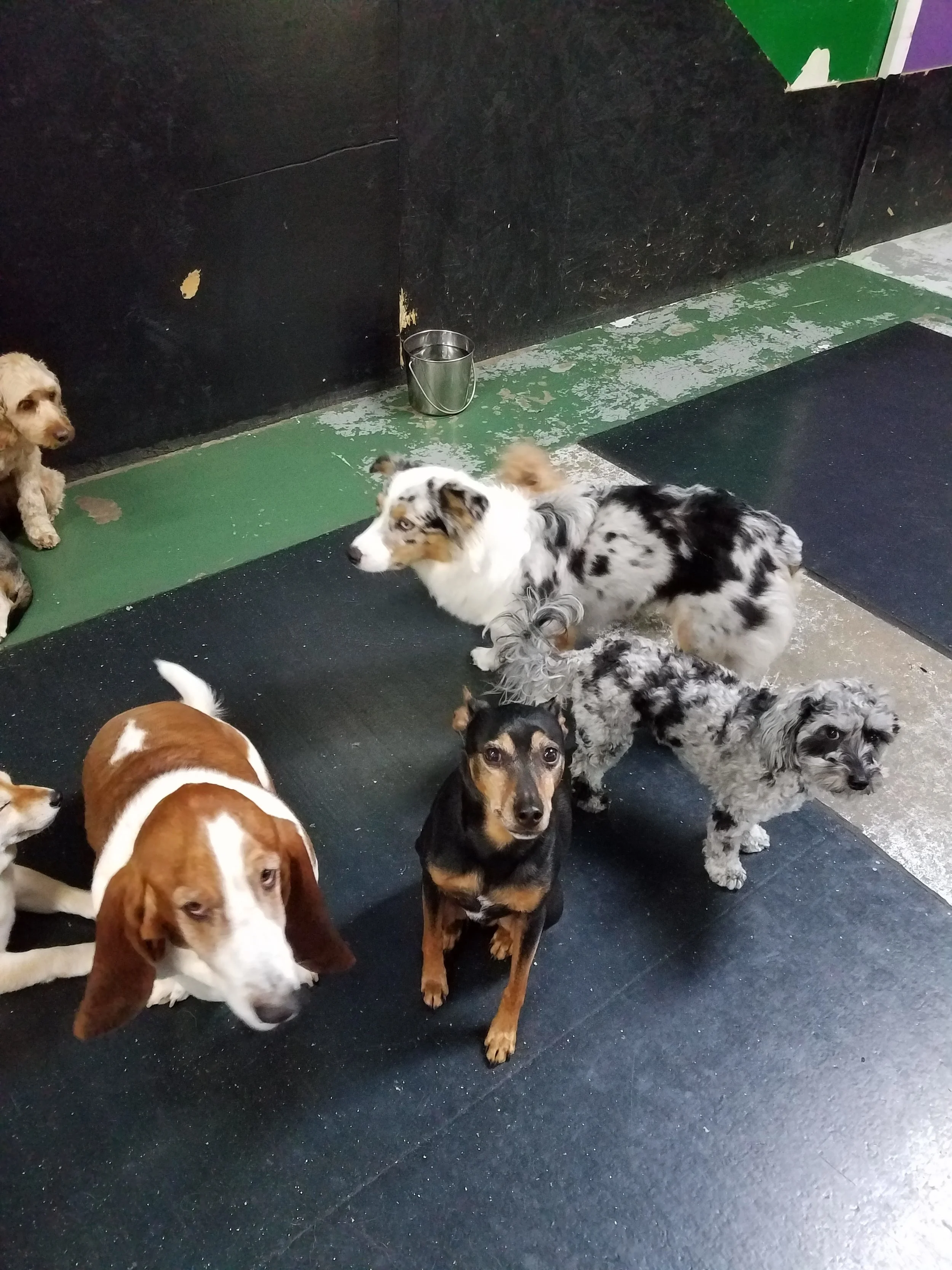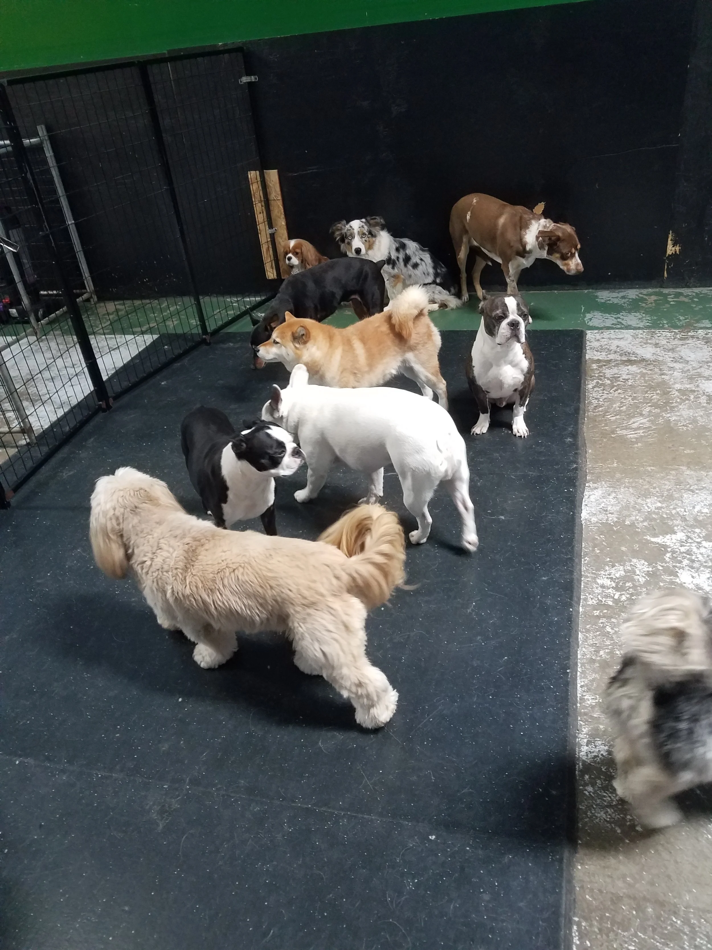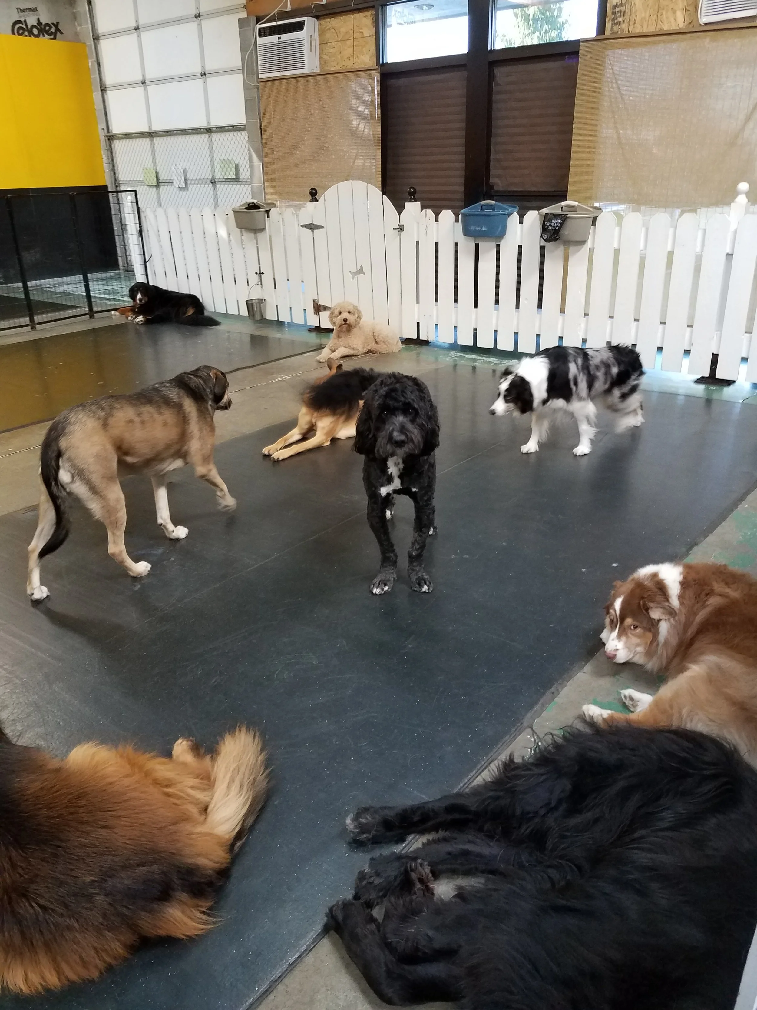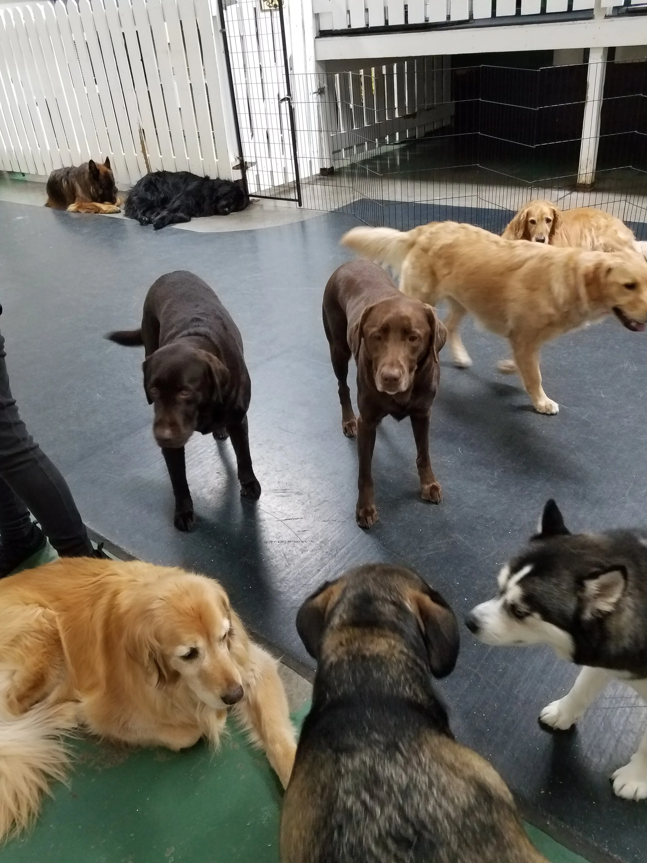 Belly up Sully invites Code to smell him, while in the background Oakuly invites Denali to play.